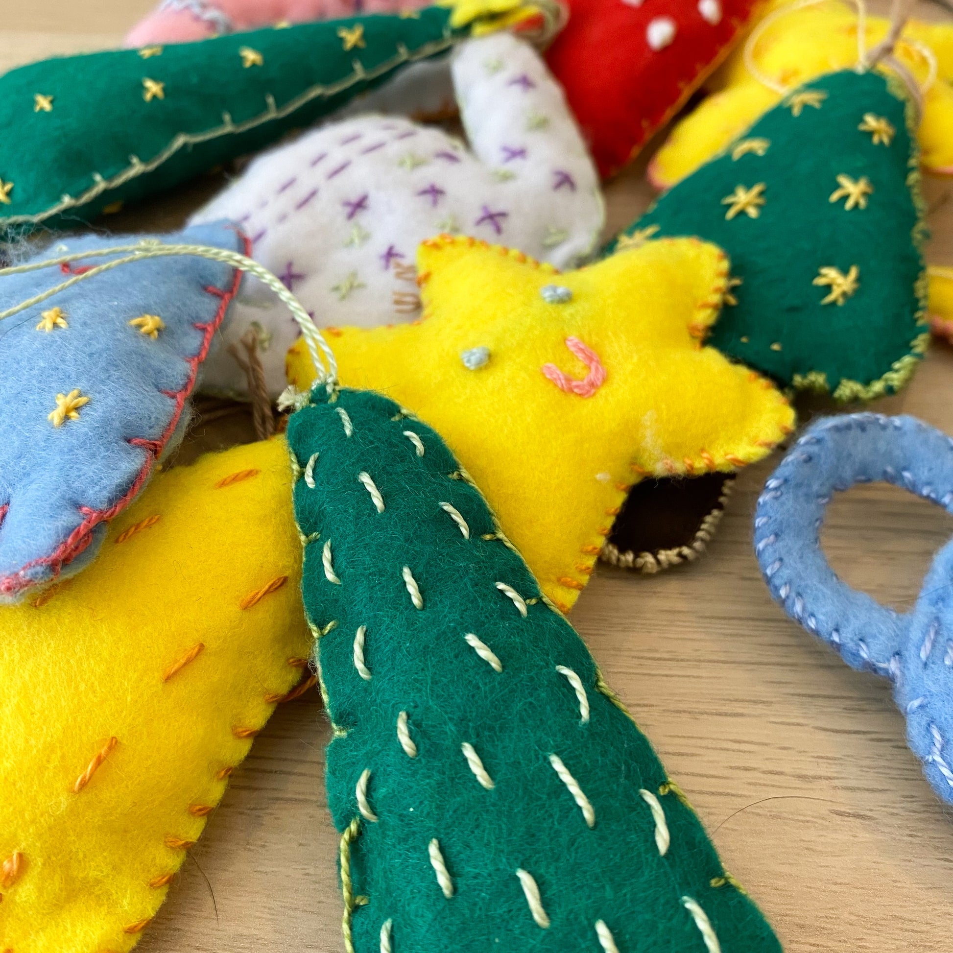 Made with felt, stuffed with cotton and sewn with embroidery threads.